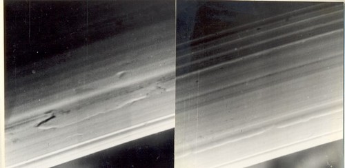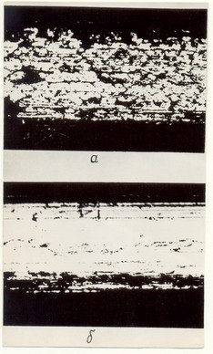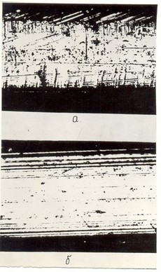 Практическое внедрение технологии ультразвукового волочения было осуществлено на заводе "Электросталь" на участке производства проволоки микронных размеров диаметром 30-50 мкм из сплава ЭИ708А-ВИ. Обработке подвергалась проволока на стадии финишной обработки. Ультразвуковые излучатели были установлены на последней фильере. На рисунках представлены фотографии поверхности проволоки без ультразвукового воздействия и с наложением ультразвуковых колебаний. Хорошо видно, что после волочения проволоки с применением ультразвука заусенцы стали в несколько раз меньше, чем без ультразвука, причем процент брака снизился с 80% до 5%.